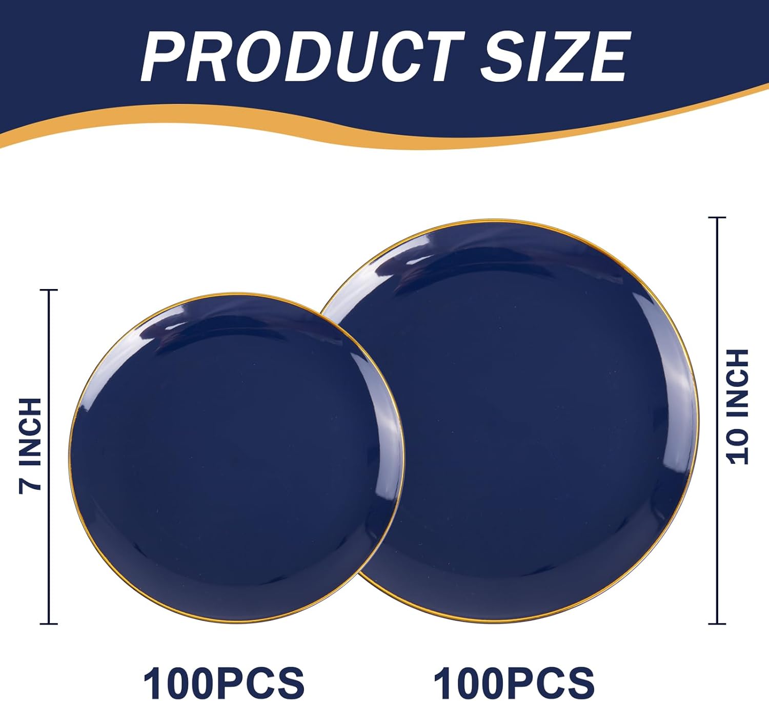 PULOTE 200 Pieces Blue Plastic Plates - Navy Blue and Gold Disposable - Include 100PCS 10 inch Dinner & 100PCS 7 inch Dessert Plate for Party