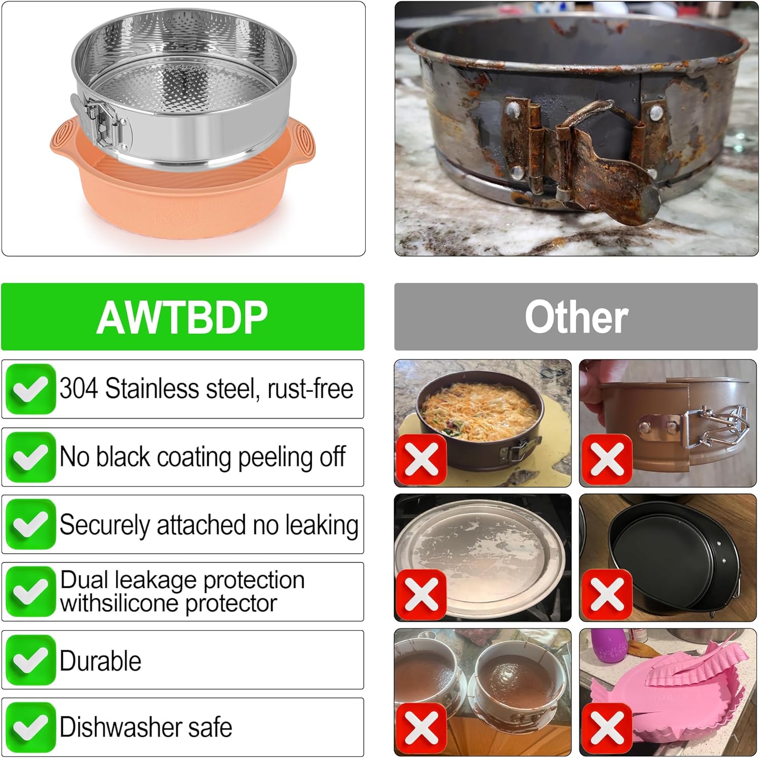 - Better Water Bathing Experience: This springform cake pan, which includes a thick and slightly stretchy silicone pan protector, no need to wrap layers of tin foil and is the perfect solution to prevent water from intruding into the pan when making a cheesecake in a water bath. The silicone pan protector makes grabbing this out of the oven much easier and can prevent unwanted and unfortunate spillage. Enjoy the convenience of silicone pan protective cover while experiencing the joy of preparing delicious meals for family and friends
