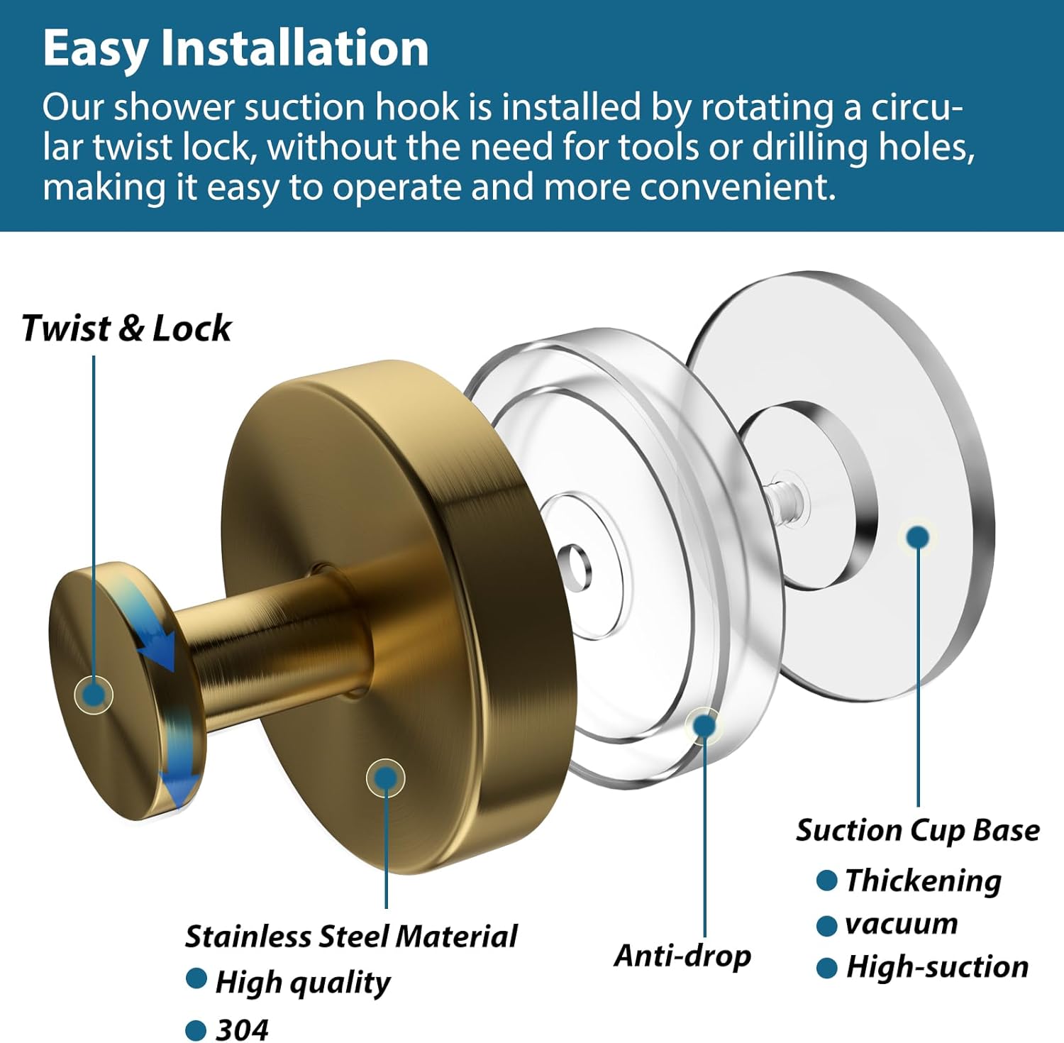 - 【No Screws Required & Reusable】 The stylish shower suction cup hook is made of waterproof and rust-proof 304 stainless steel material, and the excellent vacuum suction technology allows you to easily install and remove without tools or screws. Pry it out with a knife, clean the bottom of the command hooks and dry it for reuse.
