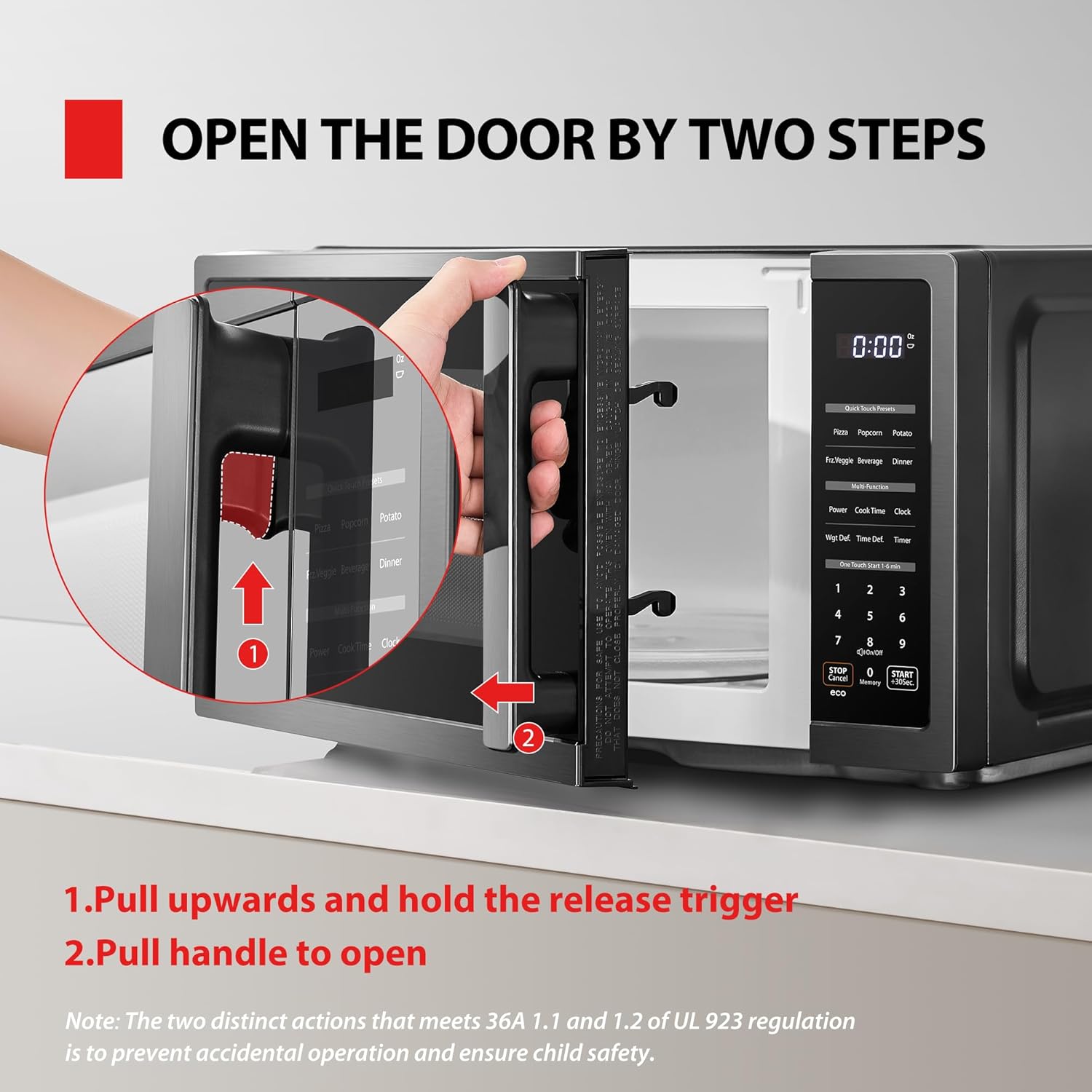 - Two-Step Child Lock: This mandatory safety feature for microwaves helps prevent unintended use by younger family members, plesase open the machine according to the steps shown in the figure.