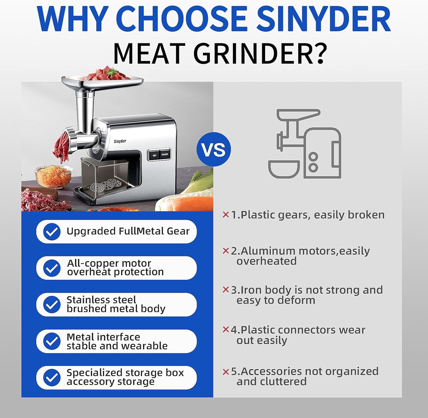- ăPOWERFUL MEAT GRINDERă Sinyder meat grinder electric is a powerful force in your kitchen, where the 100% pure copper motor has Max output of 3,000 watts and a rated power of 700 watts, easily grinding up to 2 pounds of meat per minute! Plus the built-in metal gears make using the machine more durable! Whether you're a meat lover or a vegetarian, it's a fast, convenient, and economical way to make ingredients at home, a reliable helper!