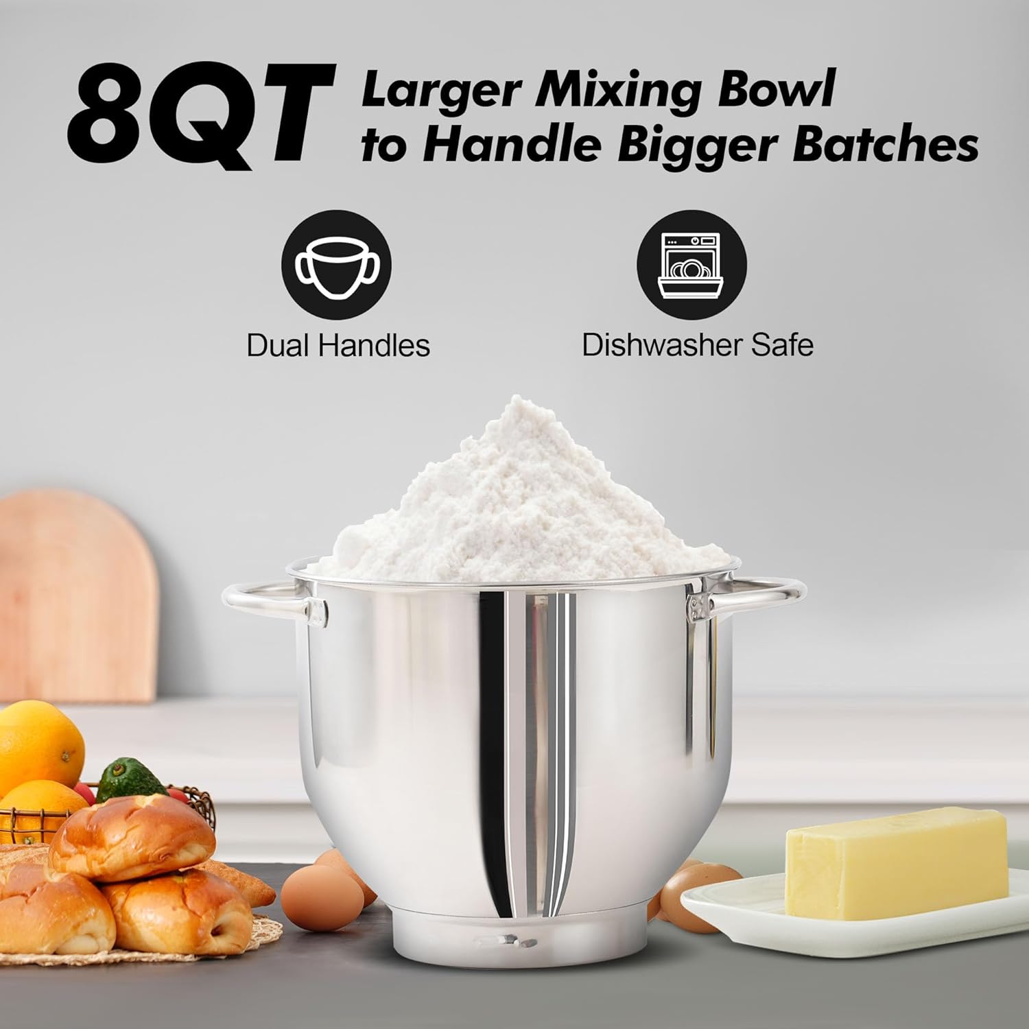 - 8QT Large Capacity Bowl With Handles - 8QT Stainless steel bowl can meet all your kitchen needs. The Stand Mixer is easy to use for making cakes, breads, cookies, pastry, muffins and waffle, and the dual handles are more convenient to hold.