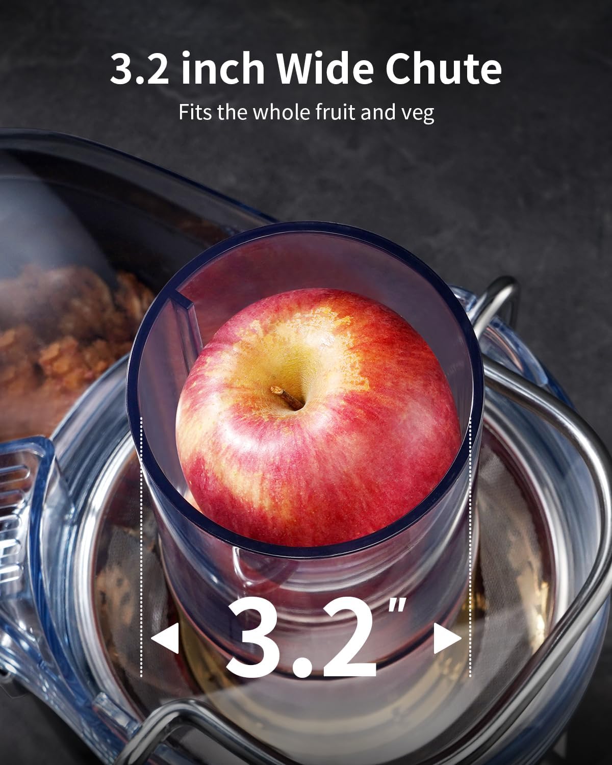- 【3.2” Wide Feed Chute】- Our juicer extractor featuring a 3.2’’ wide chute feed. This Centrifugal Juicer streamlines juicing, accepting whole fruits and vegetables without prepping or cutting. Enjoy increased yield and less mess, as produce is effortlessly fed into the juicer, minimizing spills