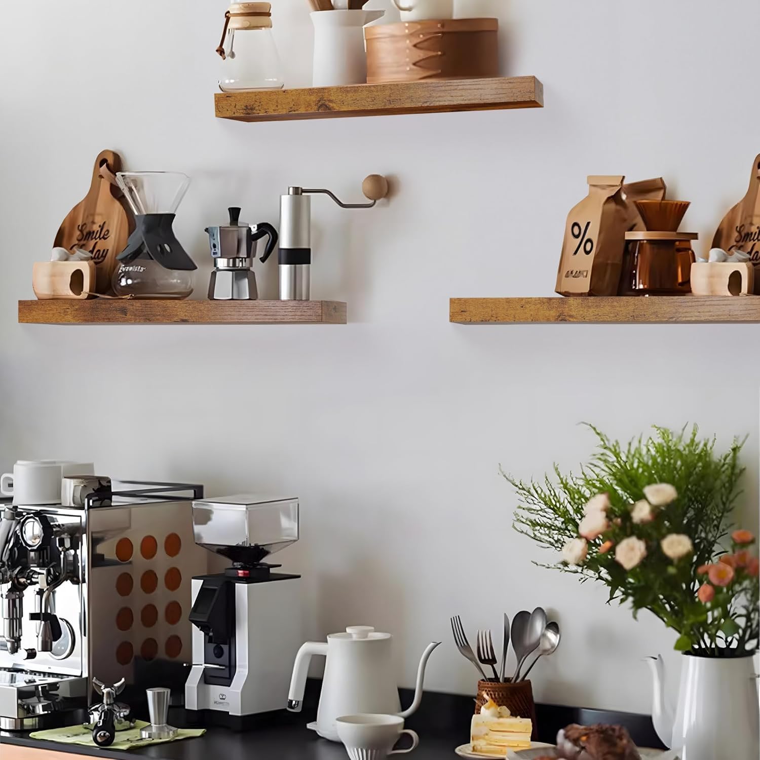 - VERSATILE AND STYLISH DESIGN: Elevate your space with our wall shelves available in wood, black, and white. These floating shelves come in three sizes (15 inches, 24 inches, and 36 inches) and feature a natural wood texture that blends seamlessly with any decor style.