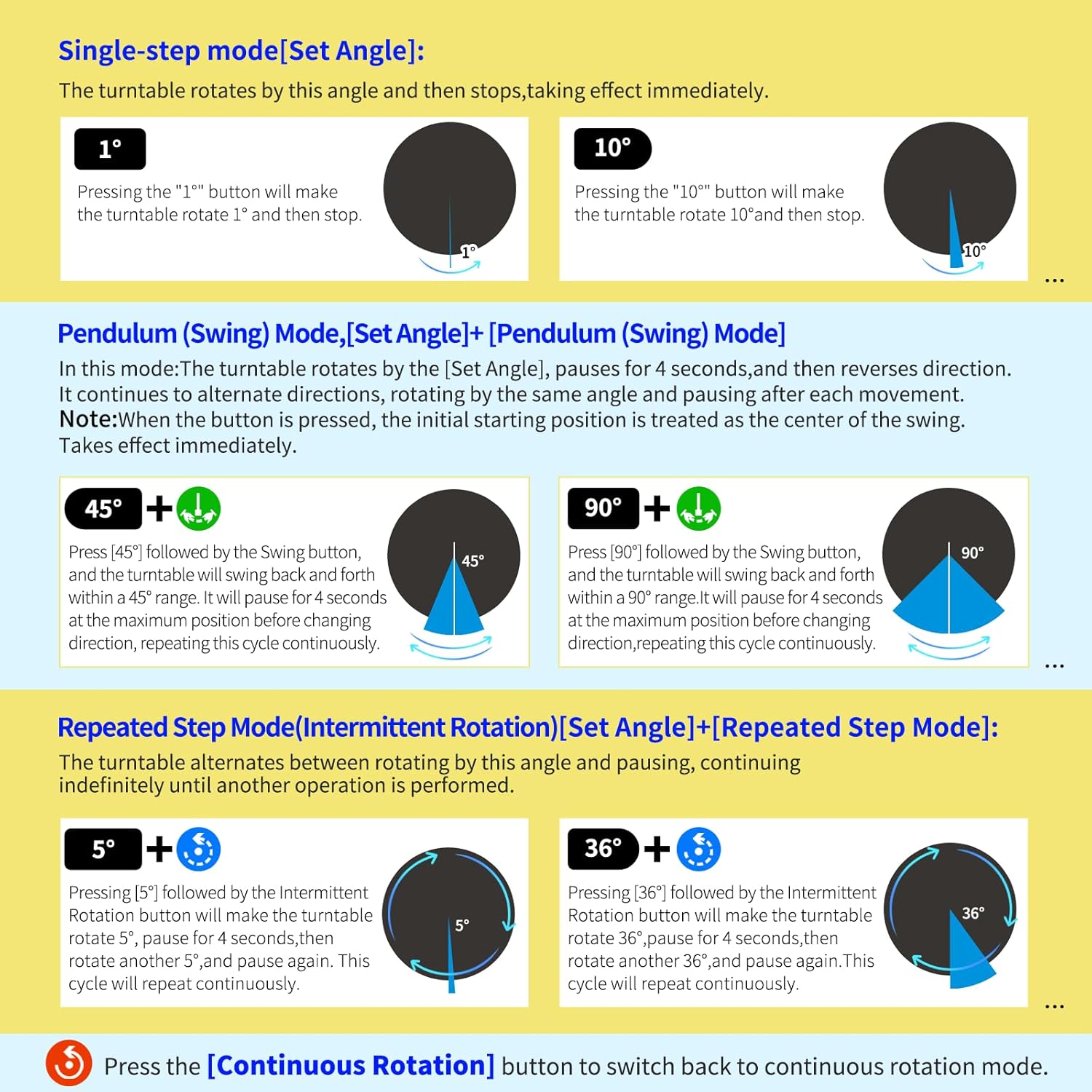 - 【This Rotating Display Stand includes a Professional Flagship Remote Controller】:Precise angle settings and user-friendly combination key design enable support for a wider range of applications. Support: Set the current position as the origin point (used in conjunction with the "Return to Origin" button). Support: Save the current settings to the turntable's internal flash. More versatile angle buttons and mode button combinations provide greater flexibility for various applications