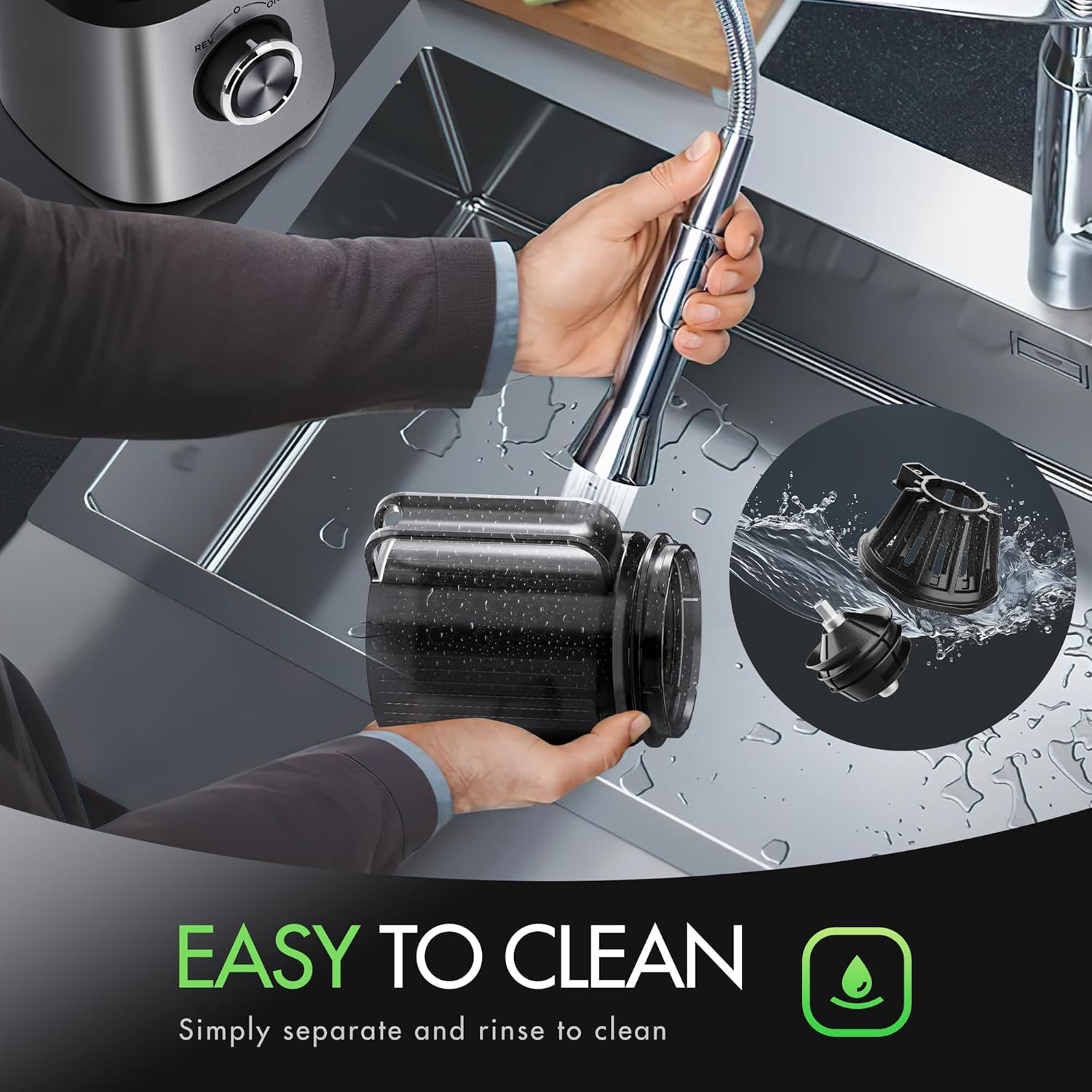 - Easy to clean: The design of this juicer is easy to install and clean. Compared with the old version, it has improved the trouble of cleaning the mesh filter, with only three parts that need to be cleaned, making the cleaning process both fast and convenient. Usually, simply rinse the components with water. In addition, all detachable components are dishwasher safe (top frame) and made of BPA free material, making cleaning very efficient.