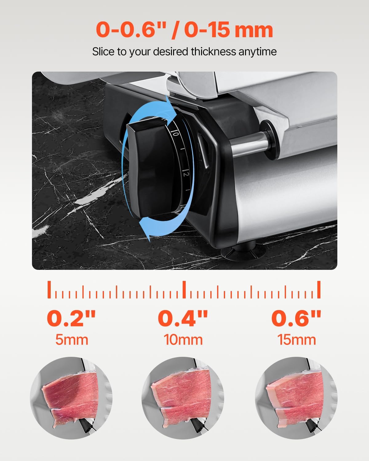 - Adjustable Thickness: The deli meat slicer features a thickness adjustment knob with a range from 0-0.6 in (0-15 mm). You can easily customize the thickness to meet your preparation needs. Ideal for making hamburgers, sandwiches, cold cuts, fruit platters, and more.