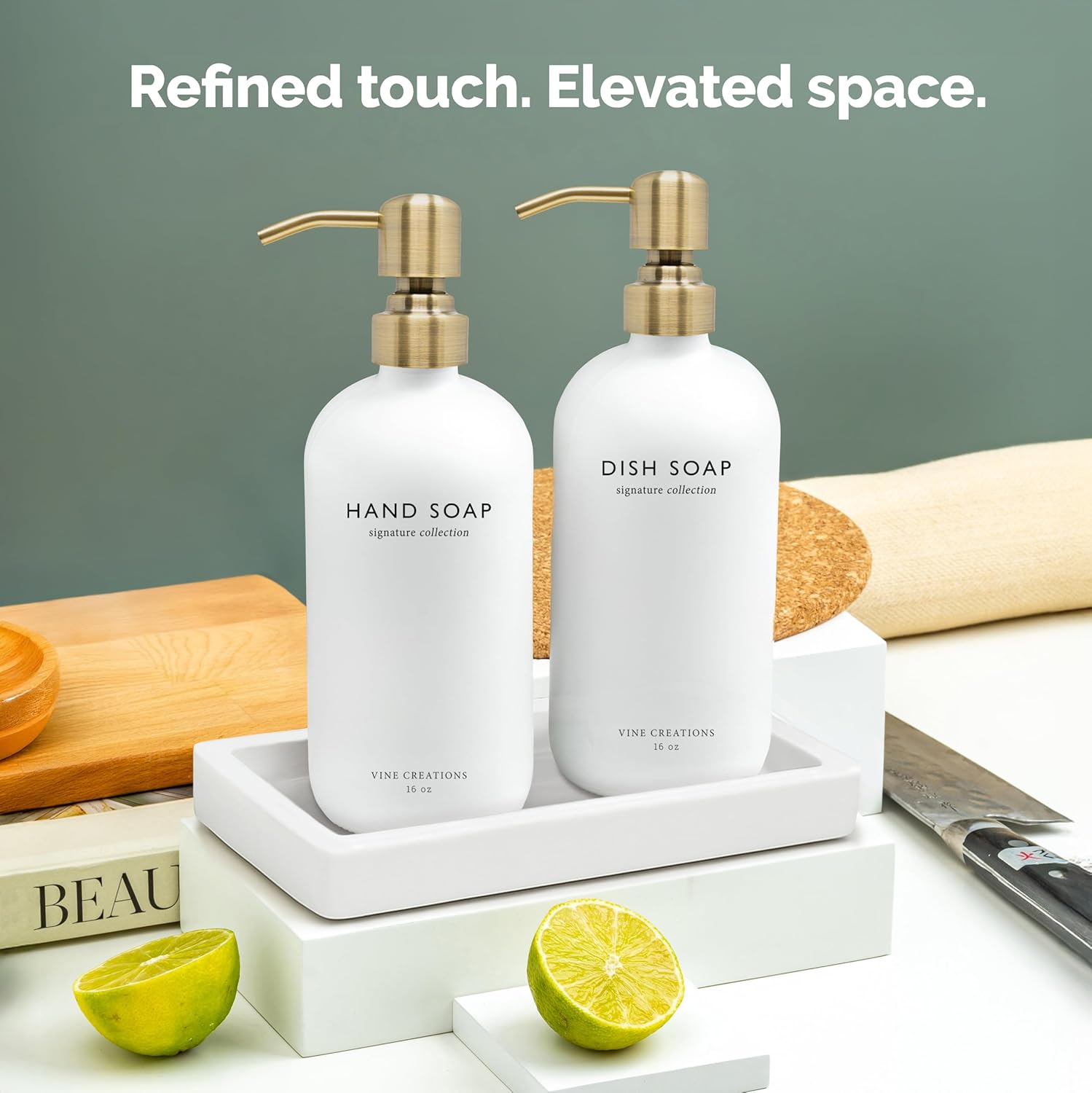 - STYLE YOU CAN FEEL – Heavier than standard dispensers, this hand and dish soap dispenser set of 2 brings substance and sophistication to your countertop. Built to last and made to impress—with a matching ceramic tray that keeps your set tidy, stylish, and perfectly organized.