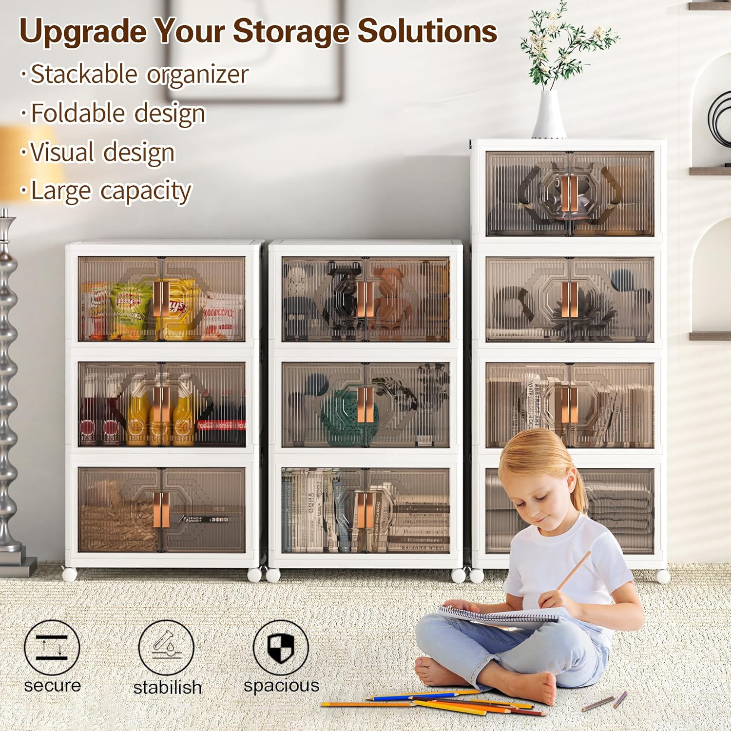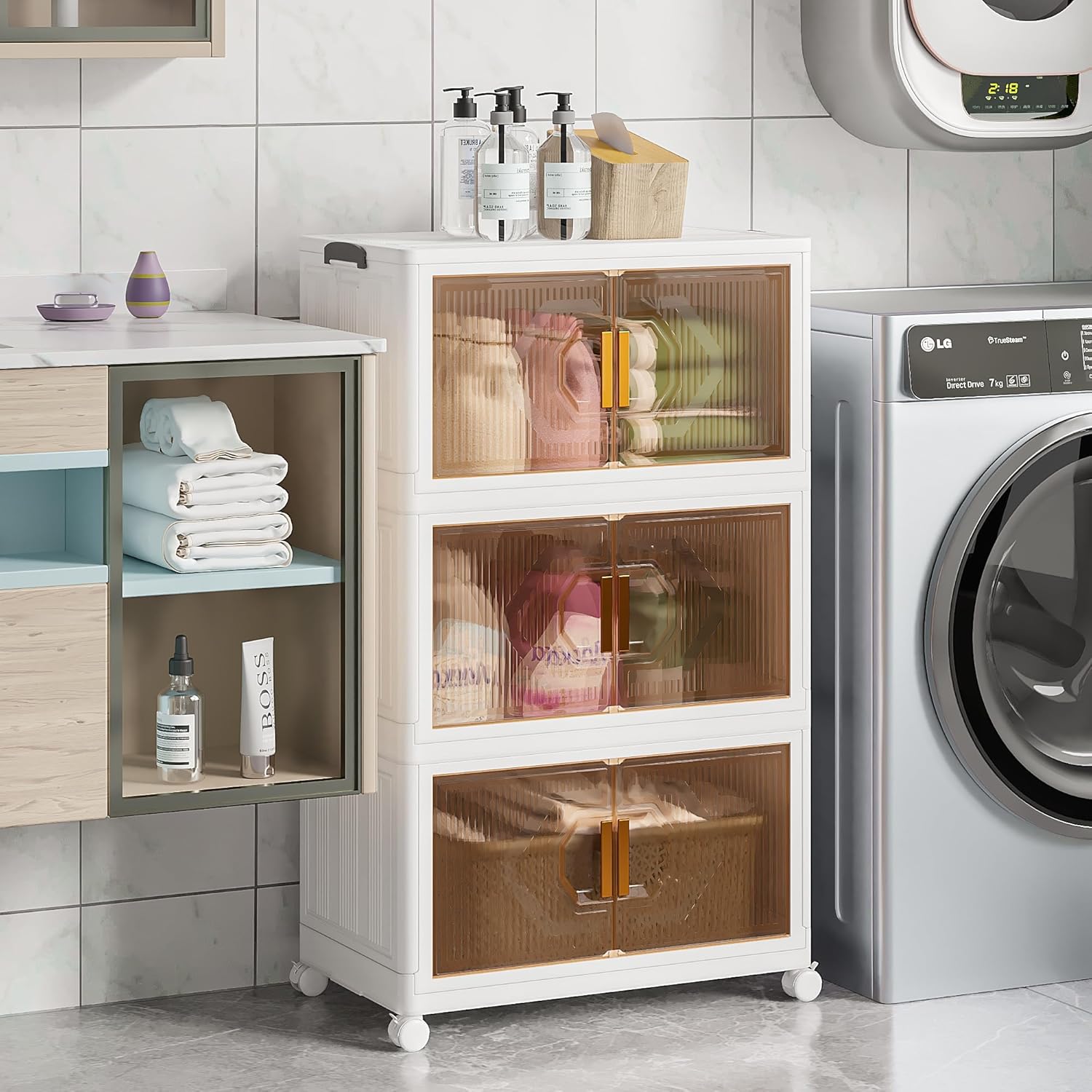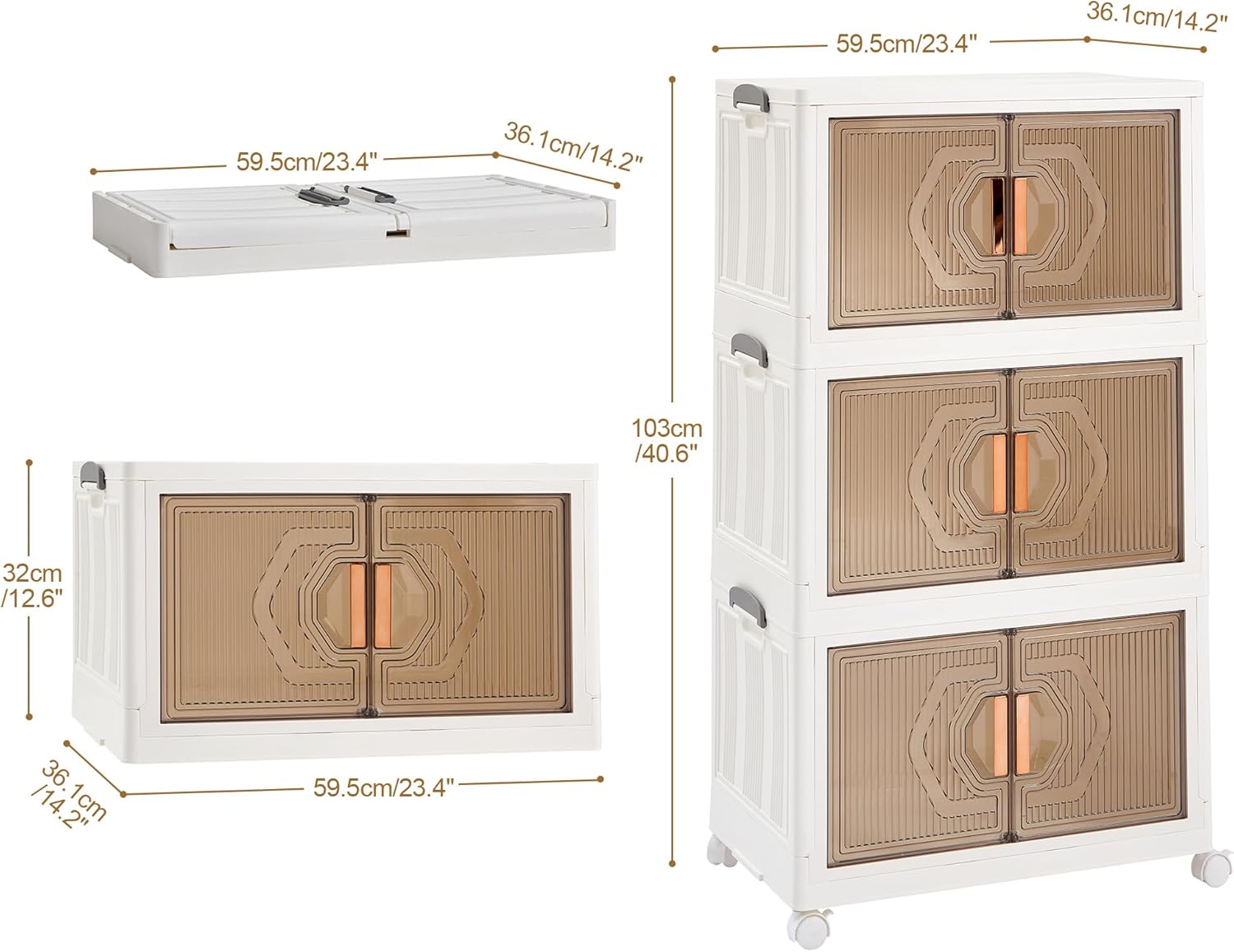 VECELO 19 Gal Stackable Storage Bins with Lid, 3 Pack Plastic Collapsible Storage Cabinet, Foldable Folding Box Organizer/Storage Container Cart with Wheel and Double Door for Home Office, White