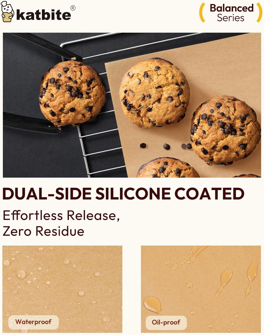 - Non-stick on both sides for easy release: Each baking paper is specially treated on both sides with high-density food-grade silicone coating to create barrier. Perfect for crispy butter cookies, soft chiffon cakes, high-sugar crème brûlée, or even greasy garlic potato wedges - everything releases effortlessly. Solves the common problem of food sticking to baking trays. Just wipe clean after use - no scrubbing needed. Makes baking clean and hassle-free. Katbite, the most trusted baking helper for professionals and home bakers alike.