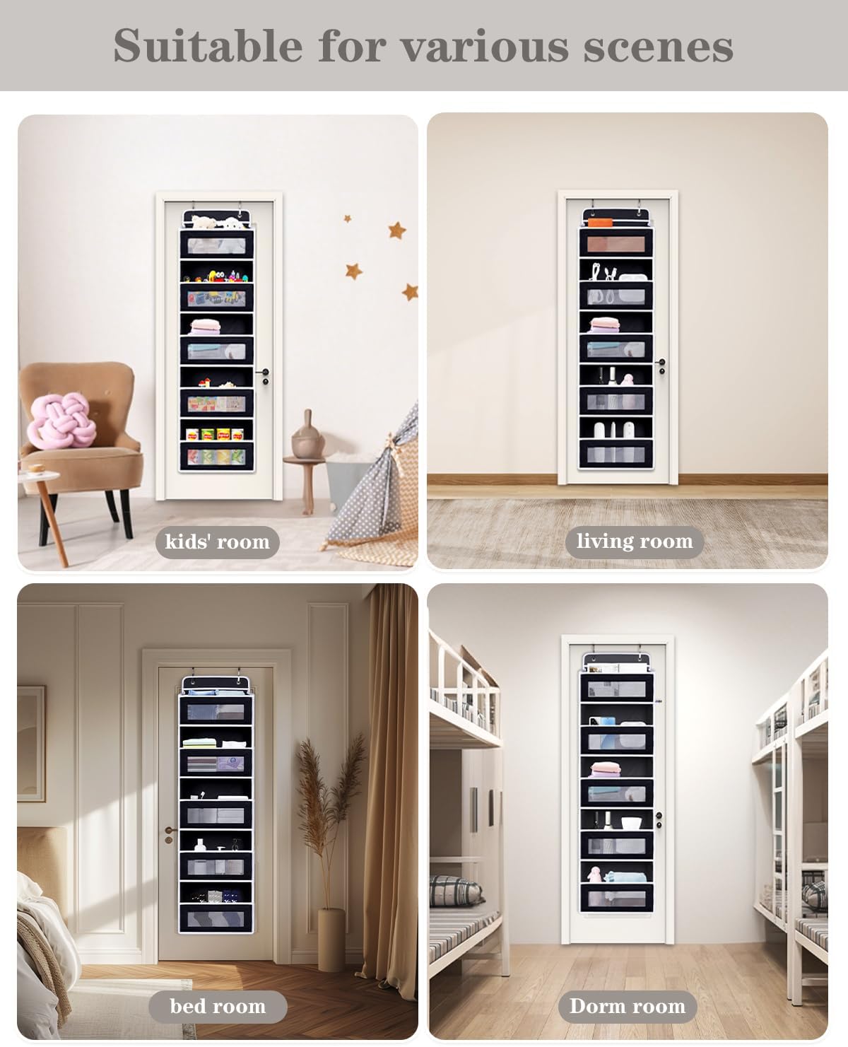 - 2. DURABLE CONSTRUCTION, STURDY AND SECURE Made of high-quality thickened fabric with reinforced stitching, ensuring long-lasting durability and resistance to tearing. The strong metal hooks securely attach to the door, keeping the organizer stable and wobble-free during use.