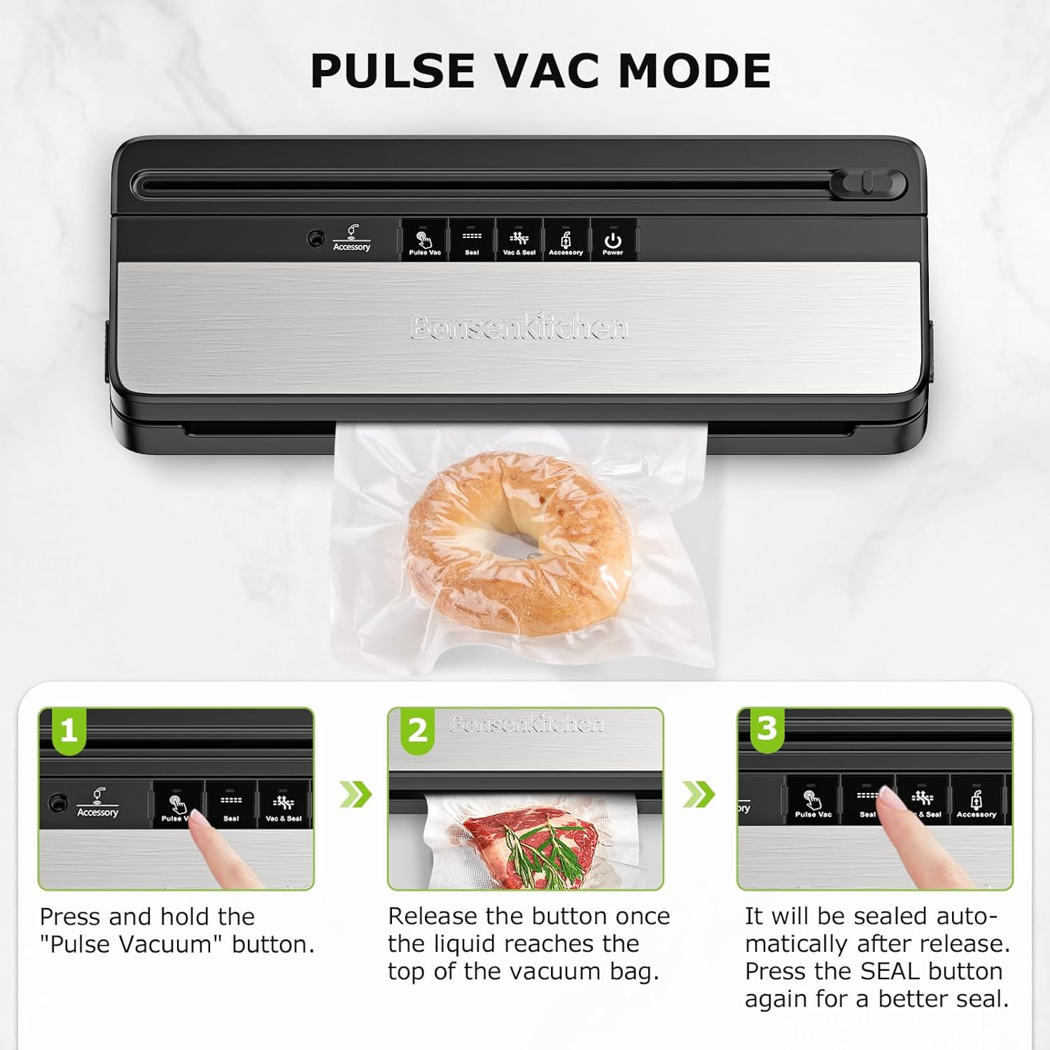 - Lock Freshness in Seconds & Prevent Waste:Bonsenkitchen’s lightning-fast sealing keeps food fresh 25× longer – no freezer burn or dehydration! Engineered for efficiency: Seal 35 bags in 15 minutes effortlessly. Perfect for meal prep, sous vide, and preserving meats, produce, leftovers, and more