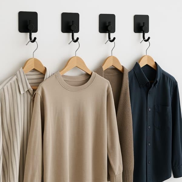 - Multi-Use Wall Hooks – Organize Every Corner of Your Home Our 4-pack of black adhesive wall hooks offers endless organization possibilities throughout your home. In the entryway, keep keys, coats, or dog leashes at arm’s reach. In the bedroom, hang accessories, hats, or bags with ease. In the bathroom, they’re perfect for towels, loofahs, and robes. The kitchen? Ideal for utensils, potholders, and cleaning cloths. Even in the garage, laundry room, or office, these hooks add functional storage without taking up space.