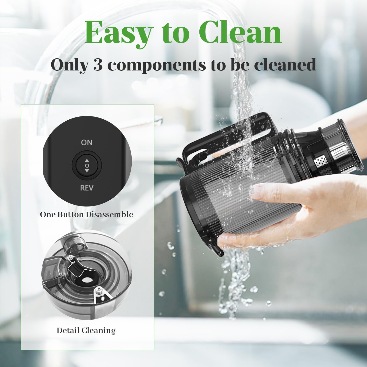 - 【50% Faster Disassembly】This juicer has only 3 parts and can be quickly disassembled in 10 seconds. The complimentary brush allows you to better clean dead spots and prevent odor.