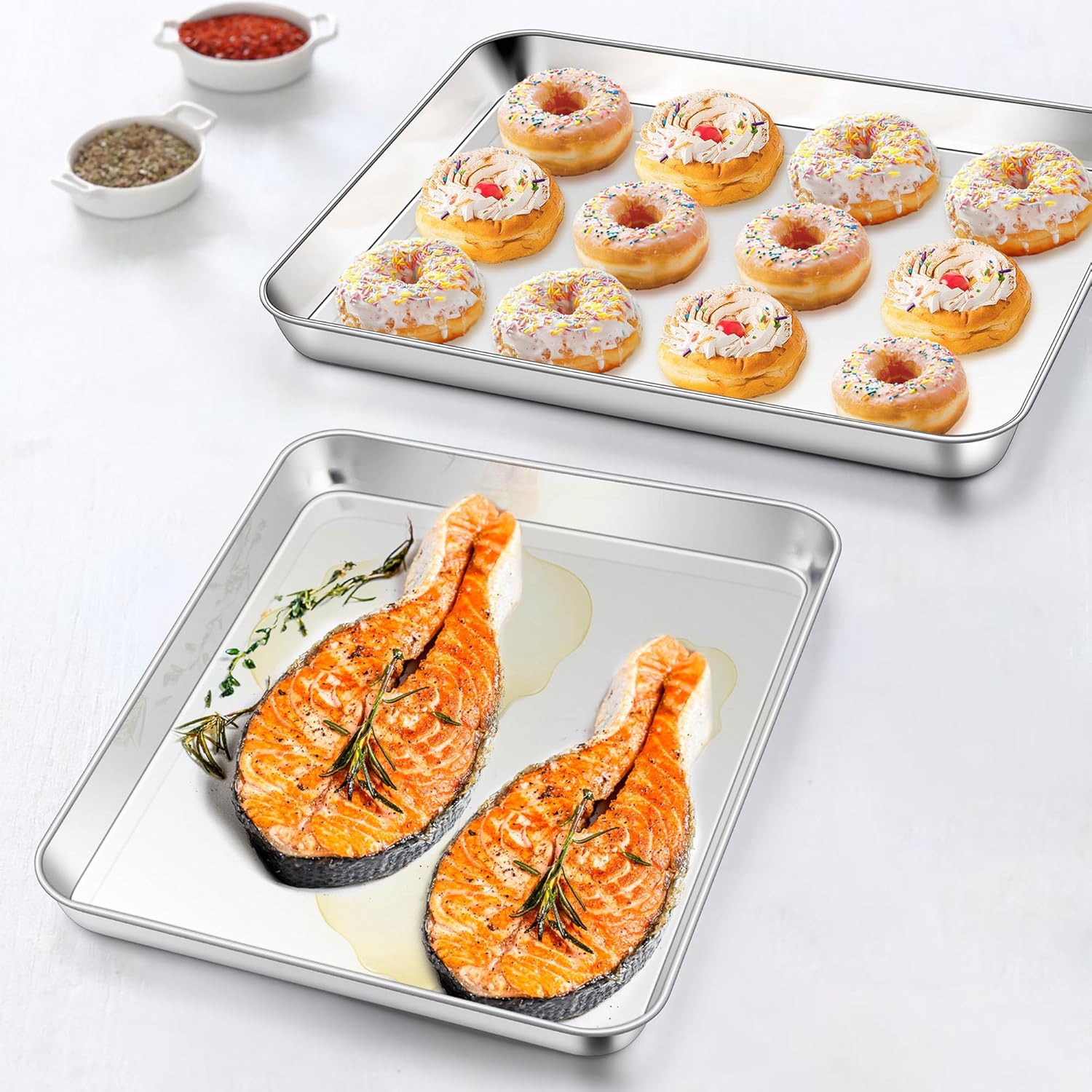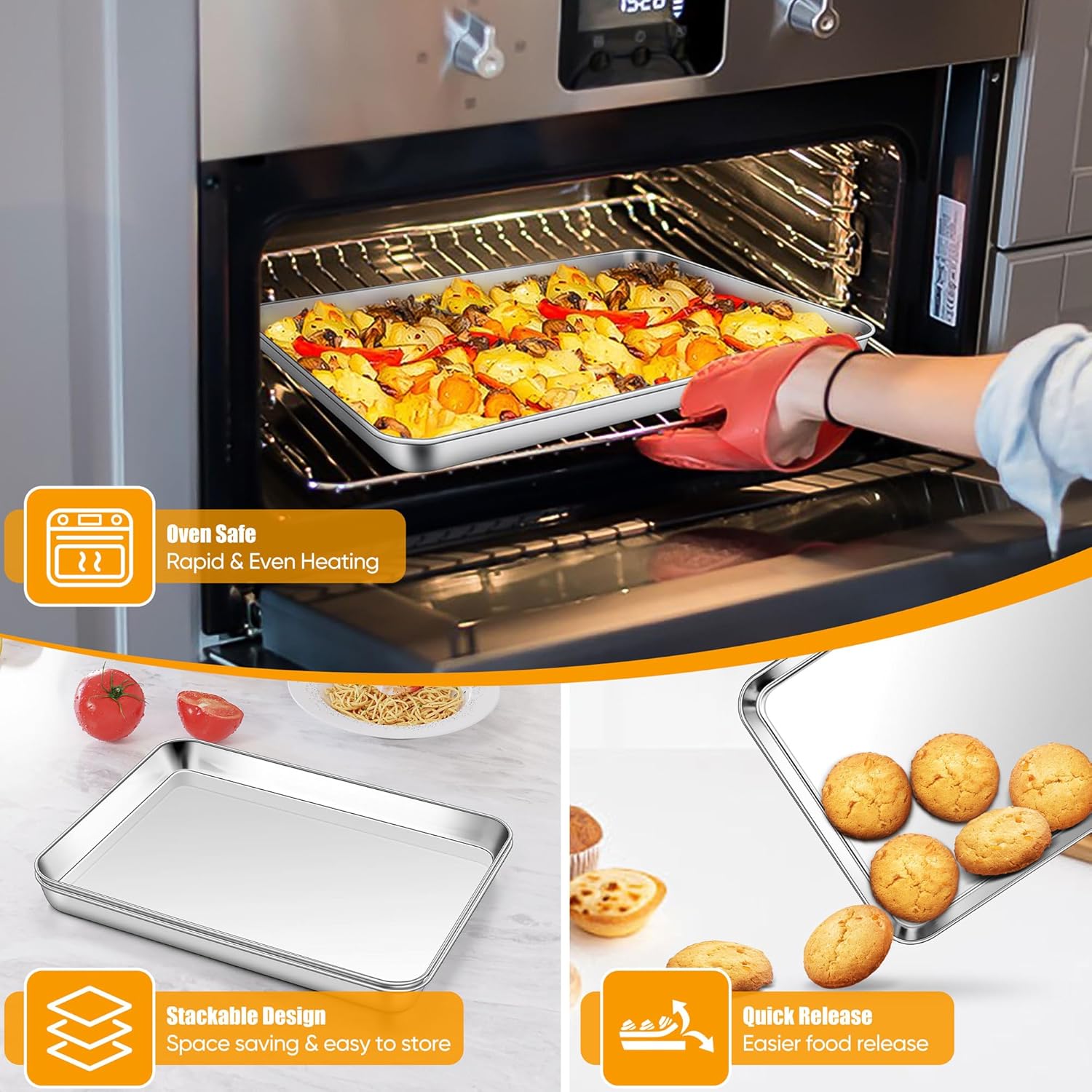 - Versatile baking, 12.4 x 9.7 x 1 inch half sheet pans fit most regular toaster ovens, medium flat baking cookie tray great for sweet or savory baking, perfect for cooking delicious dinner meals, roasting chicken, broiling steak, baking cookies, sheet cake, pizza and more, also can be used as serving tray