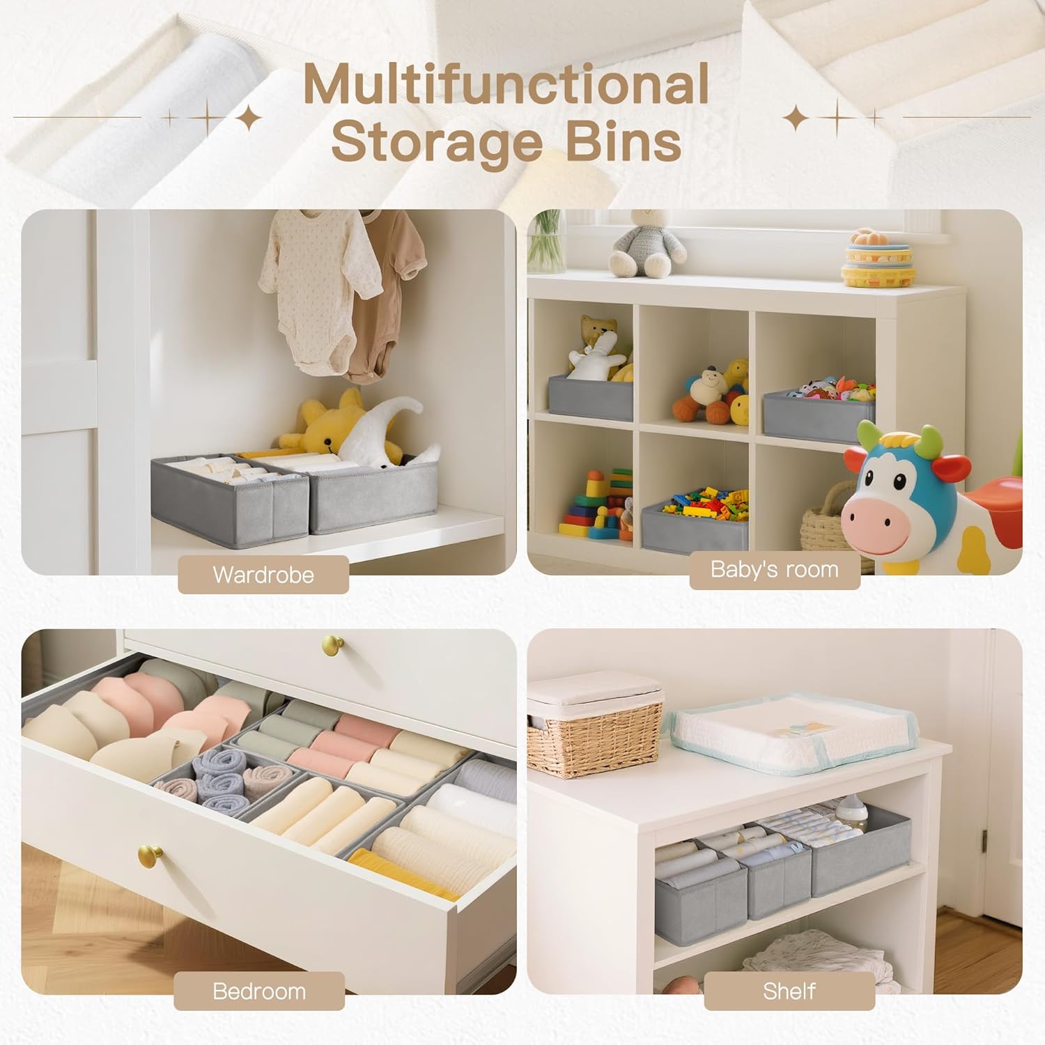 - Multi-Use: Transform any space in your home with our drawer organizer bins! Perfect for bedrooms, living rooms, offices, and kids' rooms, they maximize storage potential. Ideal for organizing baby clothes, socks, underwear, bras, and more