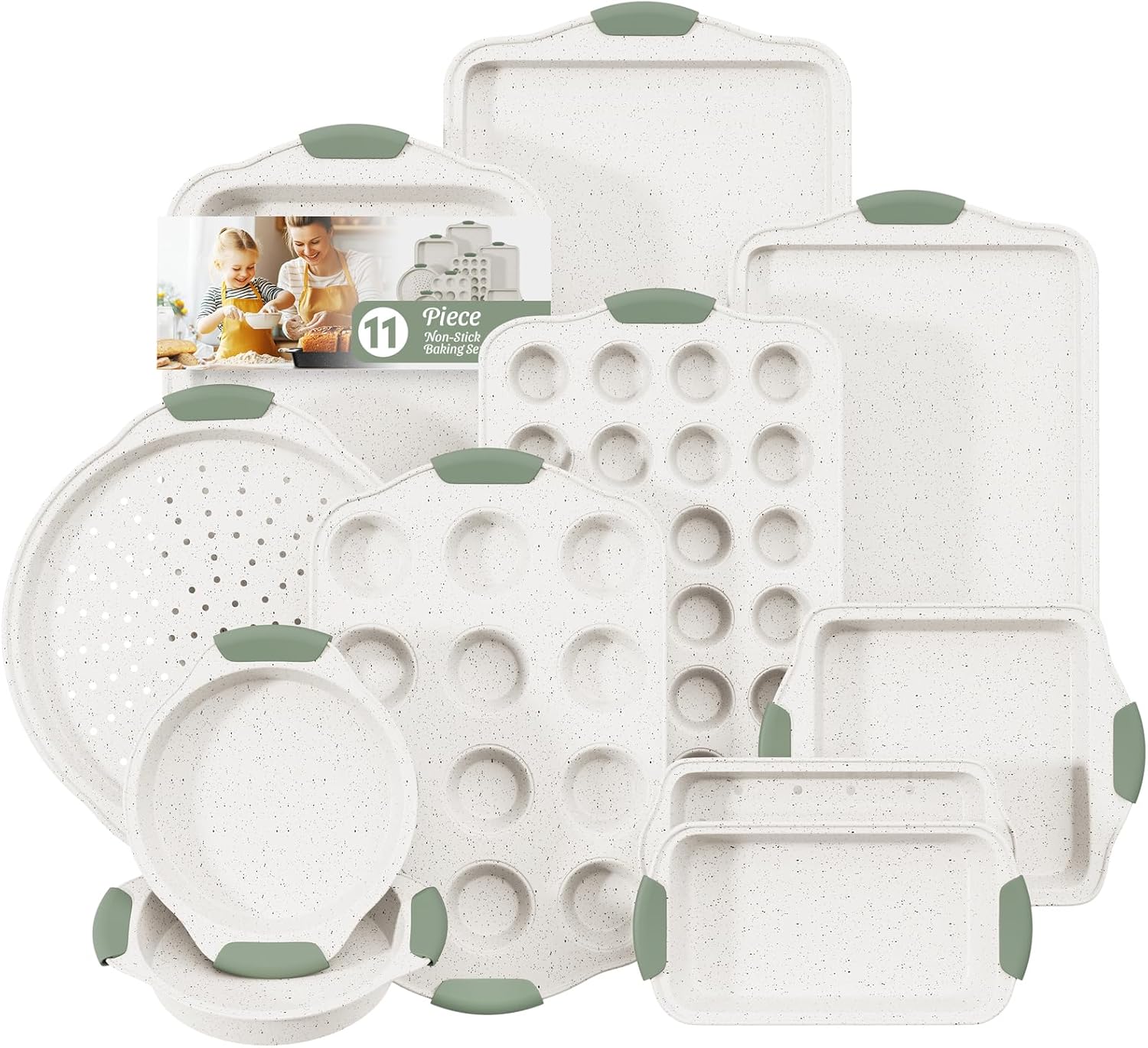 11-Piece Non-Toxic Baking Set, Stackable Nonstick Cookware with Heat-Resistant Handles - Includes Cookie Tray, Round Cake Pan, Muffin Cups, Pizza Pan & Loaf Baker, White&Light Green