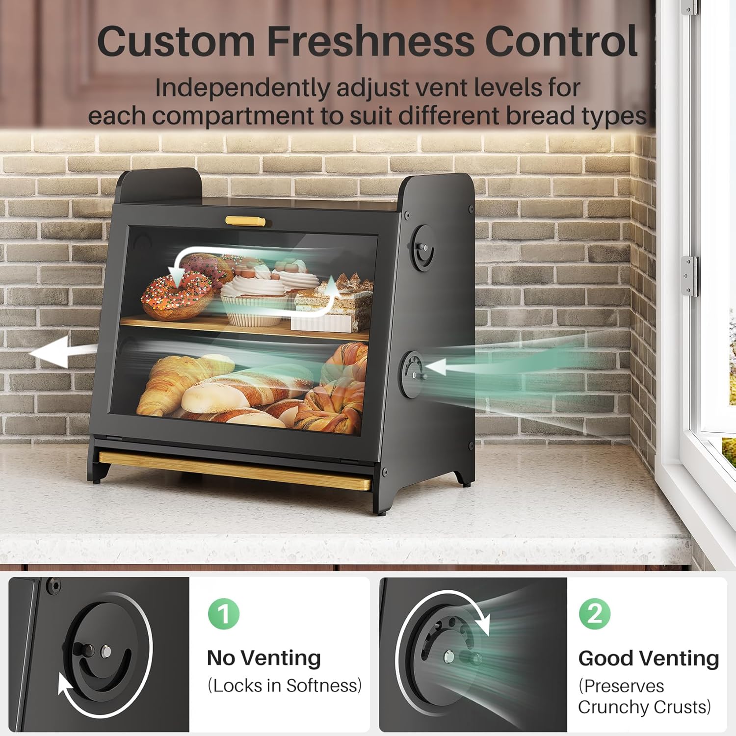 - Adjustable Vent Holes: Unlike traditional airtight bread boxes, our bread box has adjustable ventilation holes on side boards which help promoting air circulation and maintaining the right level of humidity within the box. The two separate compartments with individual convection controls optimize storage for different types of bread.