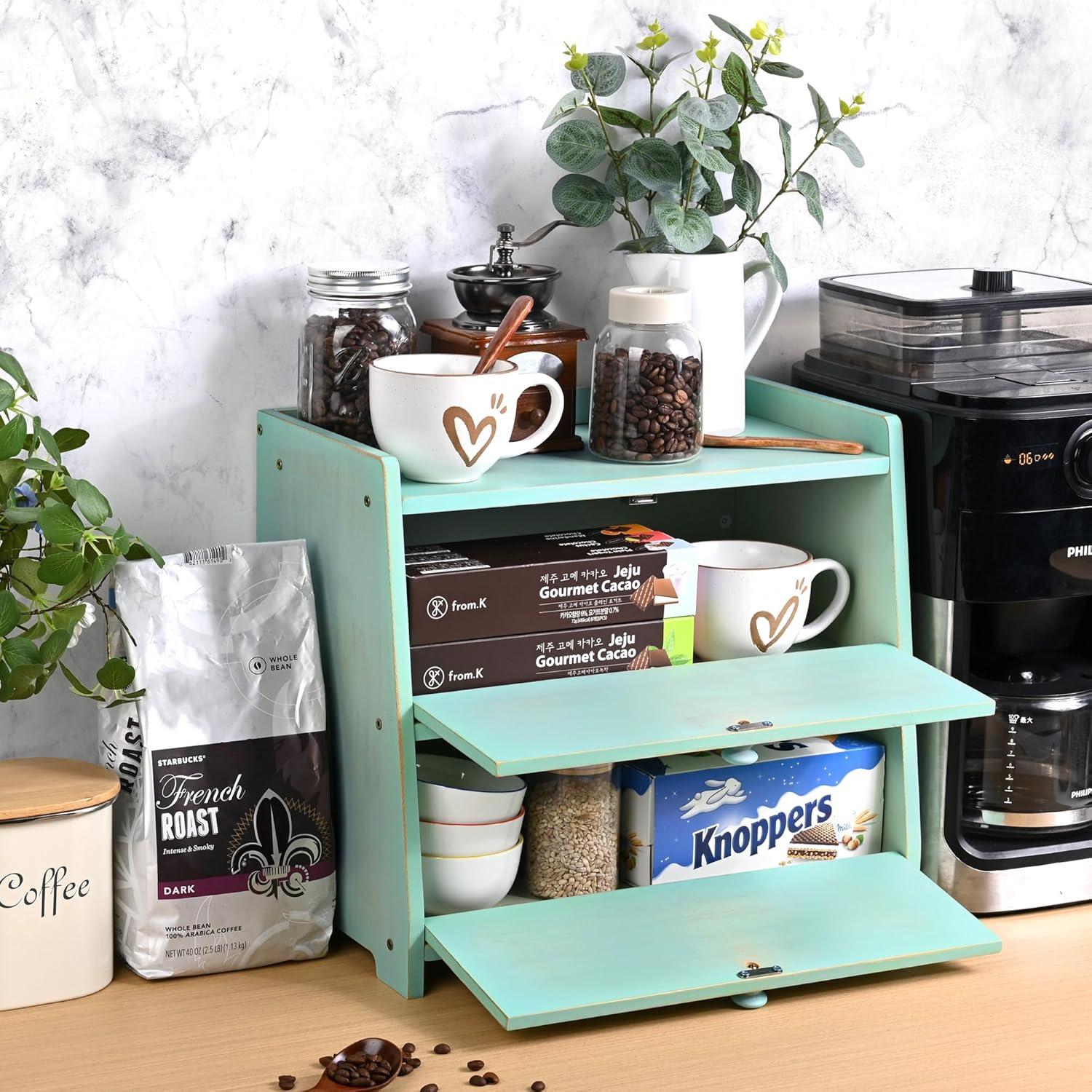 - Large Capacity: The two layers pantry organizers and storage measures 15.7*9.8*12.6 inches, the unique double bamboo panel divider design of the pantry organizer provides two separate bread storage spaces, each with its own doors, ensuring that the bread flavors never clash. you can store different flavors of bread separately in the bread holder for kitchen counter, such as long bread, loaves of bread, sandwiches, hamburgers, rolls, muffins, Hawaiian bread, bagels, crepes, etc.