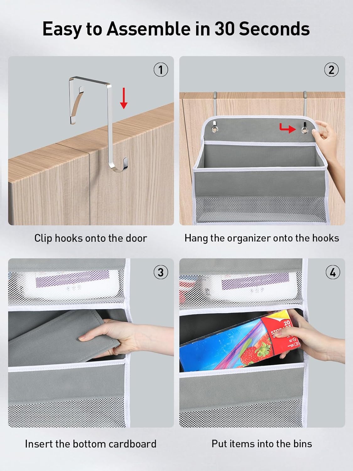 - Tool-free Assembly Within Seconds: No need to insert cardboard in the pockets as required by other bathroom storage shelves! We have it pre-inserted in the pockets to cut your hassle. Simply hang, put the cardboard in the bin's bottom, and done! Definitely a good pickup for anyone on a budget wanting to update organization and storage for extra storage.