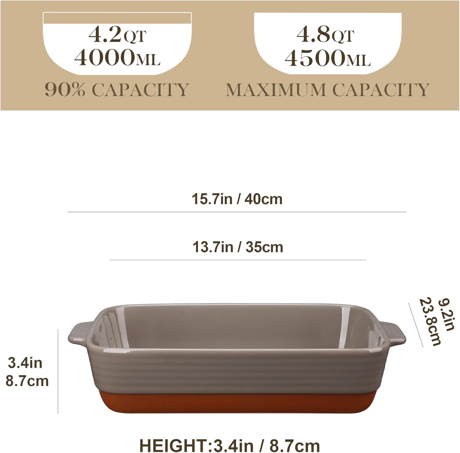 - 【Generous Capacity & Deep Design】Measuring 13.7x9.2x3.4 inches with a 4.8-quart capacity, this baking dish is perfect for cooking large portions. The deep design allows you to bake layered dishes or hearty meals with ease