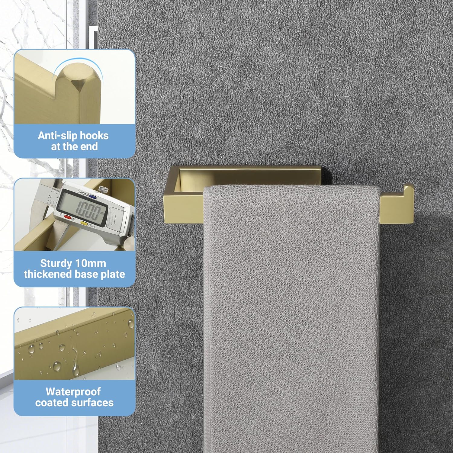 - WIDE APPLICATION - Perfect for shower, bathroom, kitchen, laundry room, cabinets, wash basins, etc. Please note, the brushed gold towel bar can only be fixed by drilling, not by pasting.
