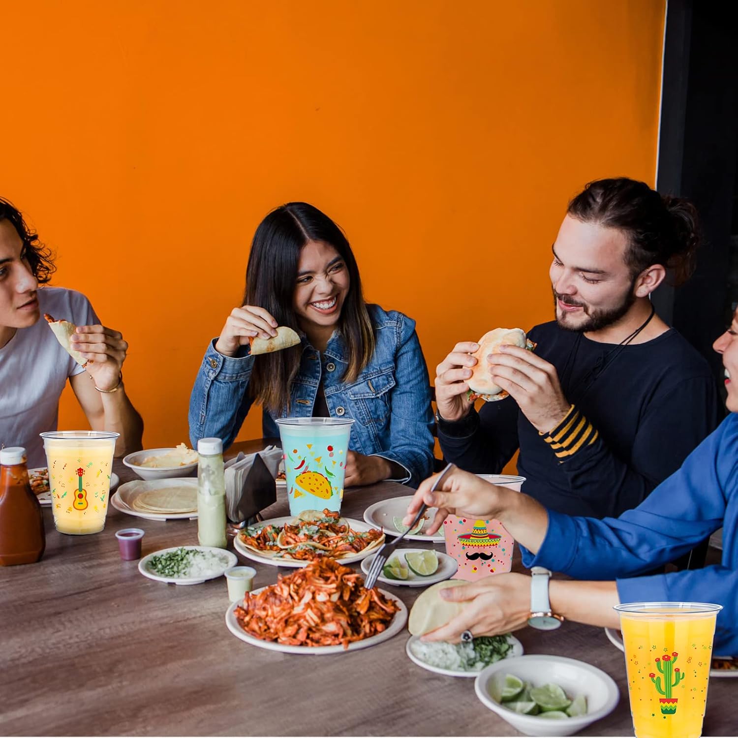meekoo 50 Pack 12 oz Fiesta Cups Plastic Mexican Cups Clear Disposable Mug Cinco De Mayo Party Decorations for Fiesta Taco Birthday Party Drinkware Supplies, 4 Styles
