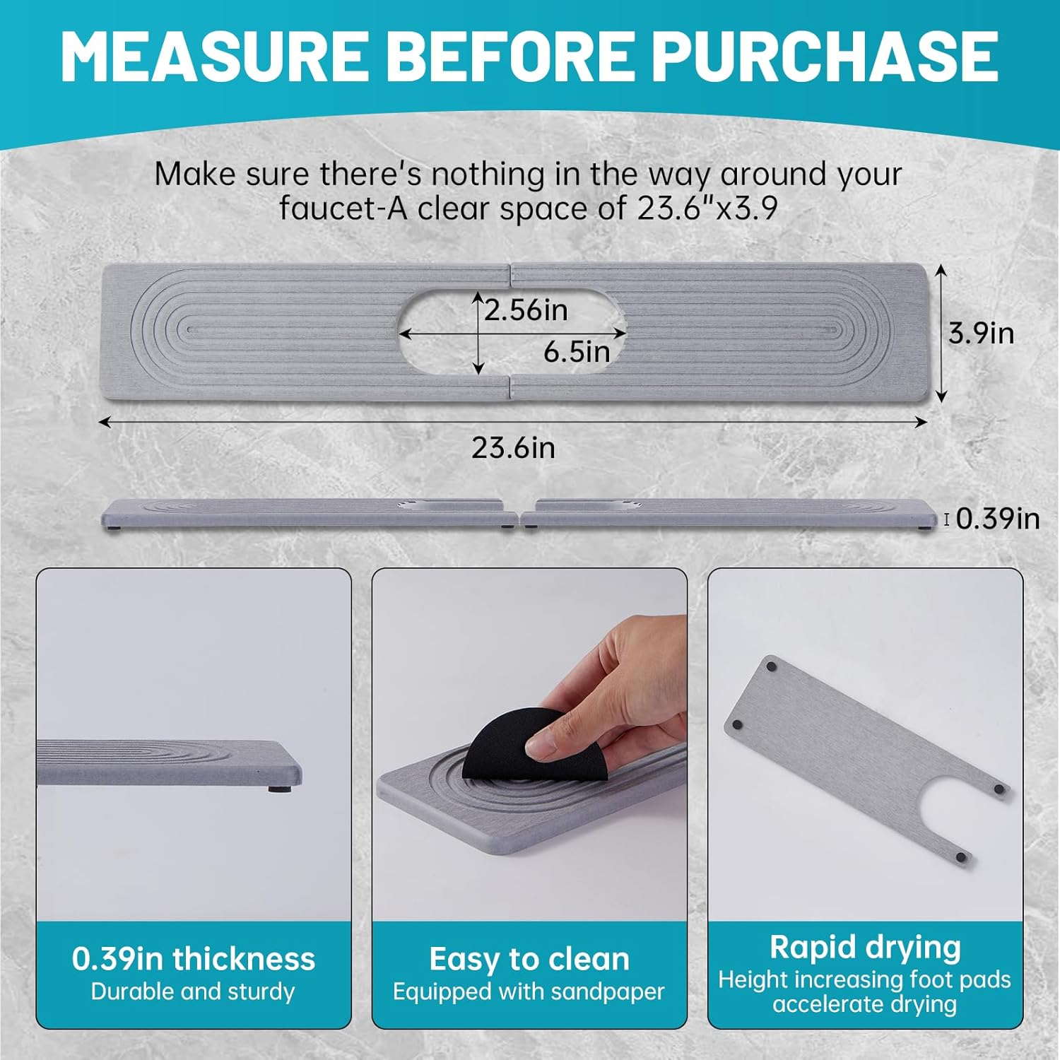 - Super Absorbent: This diatomaceous earth faucet mat absorbs water instantly, keeping your kitchen or bathroom countertop dry and clean. No more water stains or puddles around your sink.promoting a hygienic environment.