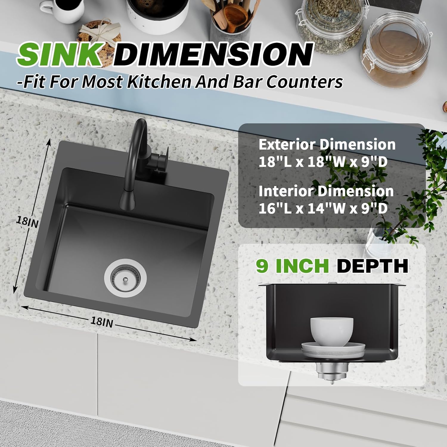- Stainless Steel Sink: With exterior size-18"x18"x9", interior size 16"x14"x9", drop in kitchen&bar sink seamlessly transition between kitchen and bar environments, catering to different needs in both settings. Black bar sink is nice choice for versatile use across kitchen/wet bar applications.