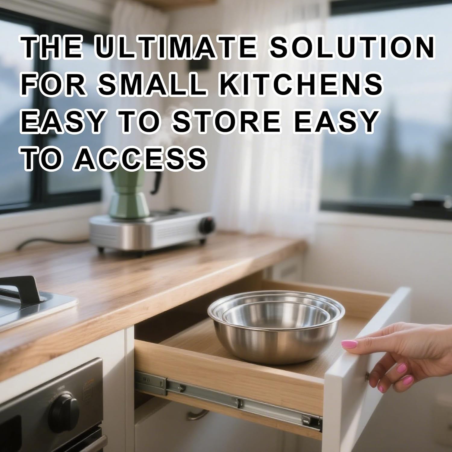 - [MAXIMIZE SPACE: ULTRA-COMPACT NESTING DESIGN] These mixing bowls stack seamlessly into a single unit (just 3.15" tall!), saving 70% cabinet space – perfect for cramped kitchens, apartments, RVs, or dorm rooms. Free up room for other essentials without sacrificing a full mixing set