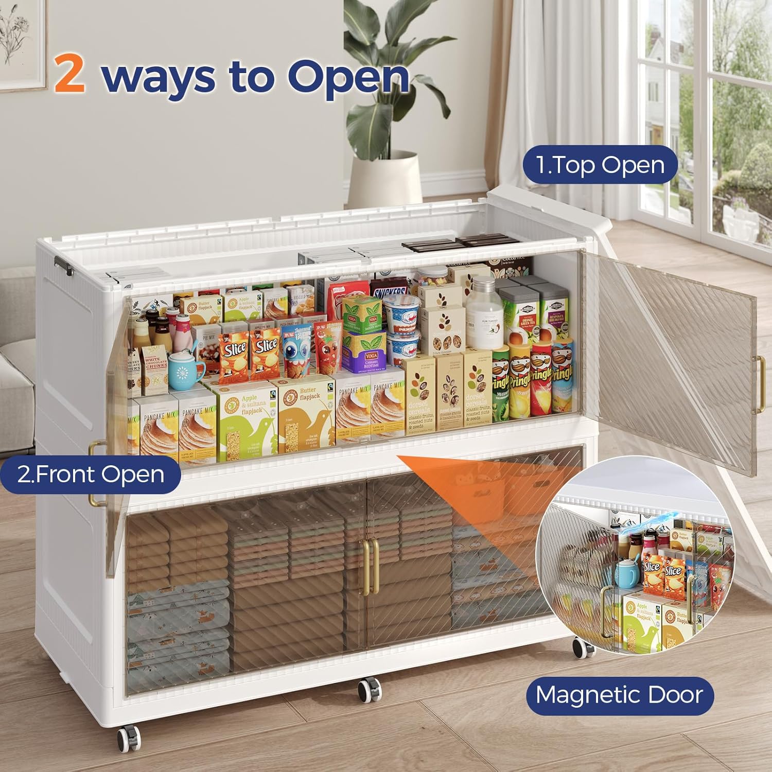 - 【Two Ways to Open & Magnetic Doors】The collapsible storage bins with lids and wheels feature a dual access way, allowing for both top and front door openings, and with clear brown windows for easy visibility. The super huge storage bins with open front doors are equipped with magnetic lock buckles to prevent dust from entering the cabinet.
